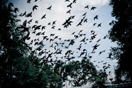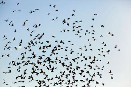 A flock of pigeons flies in the sky at sunset. The concept of freedom.