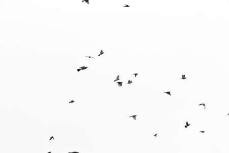 photographed close-up blue sky, in which a flock of birds flying, visible silhouettes, daytime,