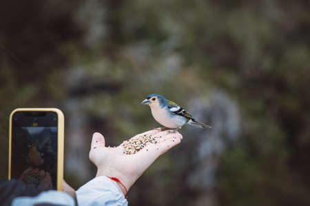 Rare Madeiran chaffinch flies onto a girl's hand to get some food crumbs, the woman captures this once-in-a-lifetime moment on her mobile phone. Levada dos Balcoes, Madeira, Portugal.