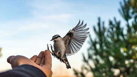 bird eating from a person's hand in green jacket over a forest with a picnic table