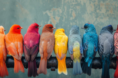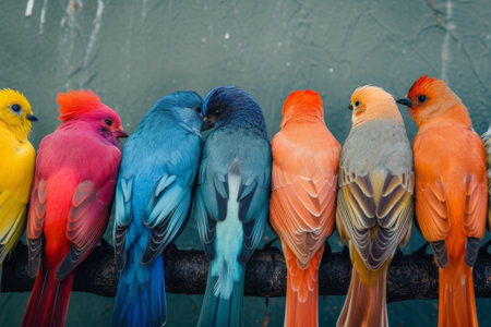 A group of vibrant birds sit on top of a metal rail in this lively and captivating photograph.
