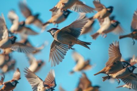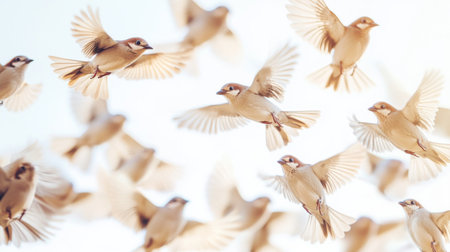 Dozens of sparrows soar through the air on a sunny day, showing their graceful flight patterns.