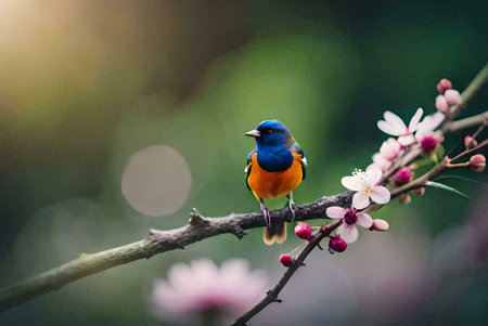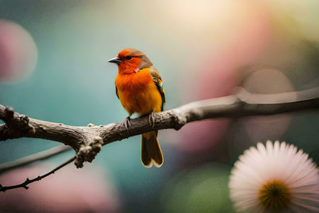 a small bird perches on a moss-covered branch in the norwegian wilderness, showcasing a beautiful blend of dark yellow and orange hues. the bird strikes a dignified pose, reminiscent of wimmelbilder and whistlerian art styles. this national geographic photo captures the essence of cranberrycore aesthetics in the midst of stunning norwegian nature. ai generated