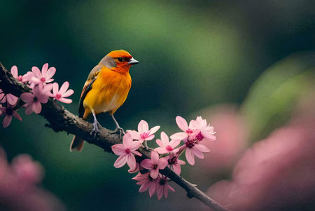 A striking yellow bird with a black head rests on a branch adorned with bright orange flowers. The photograph displays a shallow depth of field, with a soft green background. The lighting suggests a natural outdoor setting, offering potential uses for nature-themed projects, editorial content, and decorative purposes.