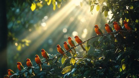 A group of vibrant orange birds sits on branches, basking in the warm sunlight that streams through the lush green leaves of the forest. The serene atmosphere highlights nature's beauty.