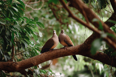 Two brown doves are resting on a tree branch amidst vibrant green leaves. The peaceful setting captures the beauty of nature during a calm day.