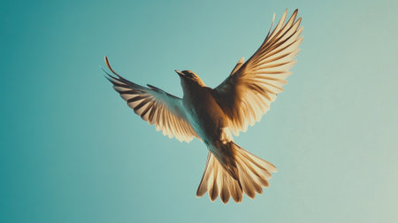 A stunning image of a bird gracefully soaring in the sky, capturing the essence of freedom and tranquility. The colorful wings spread wide against a serene blue background.