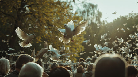 Group of White Birds Flying Over Forest, Serene Scene of Nature in Motion