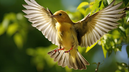 A charming scene of a parent bird feeding its hungry chicks in a cozy nest, surrounded by lush greenery, capturing the essence of nurturing and wildlife.
