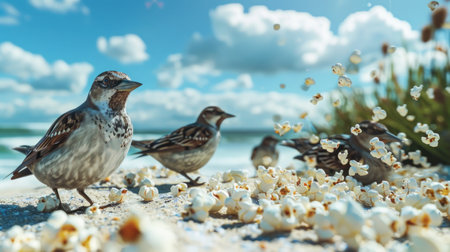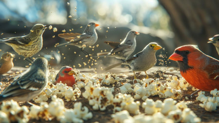 A group of birds pecking at scattered popcorn on a sunny day, showcasing the simple joys of feeding wildlife , Hyper realistic