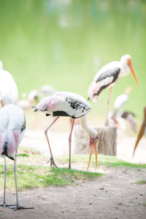 Flock of Painted stork on the lawn in safari.