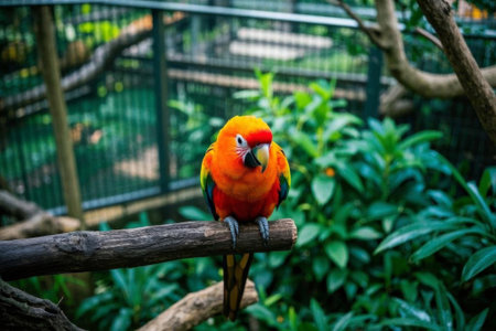 Colorful sun conure parrot at perched on fence of cage