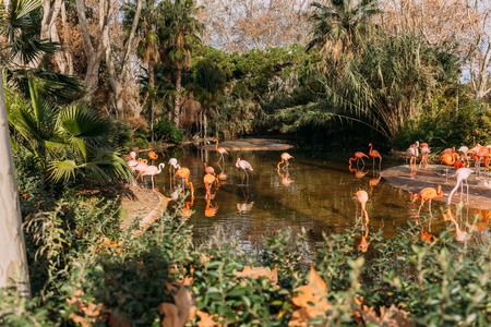 flamingos walking in zoo pond surrounded with lush plants, barcelona, spain