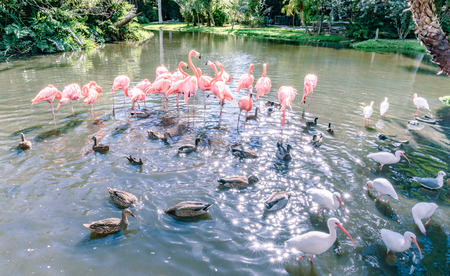 Pink flamingo birds in the park.