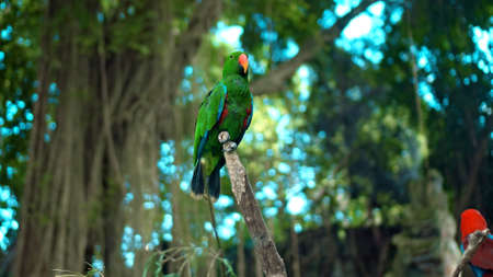 Parrot green Eclectus roratus with green feathers in the usual habitat with green grass and sprawl sits on a wooden branch