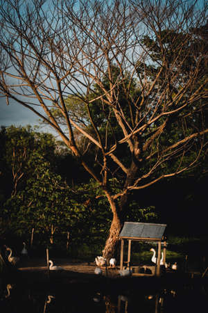 sunlight reflection in pond with group of goose near pond surrounded by nature forest.