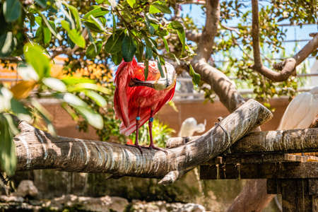 Scarlet Ibis red bird birds in tropical nature rainforest jungle and park in Foz do Iguacu State of Parana Brazil.