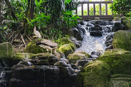 Birds drinking water from an artificial waterfall, young yellow-billed stork or Mycteria ibis and Cattle Egret or Bubulcus standing on stones in Kuala Lumpur Bird park, Malaysia.