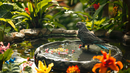 Grey parrot standing on a rock in a vibrant garden pond. Concept of birdwatching, exotic pets, tropical birds, nature.