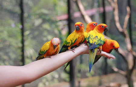 Beautiful group of Sun conure parrots are eating food on human hand.