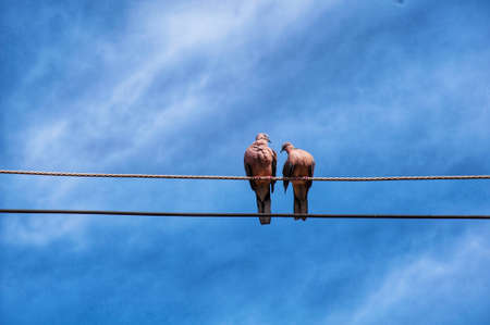 2 Dove catching On Electric Wire, blue Sky Background Beautiful blue in the evening