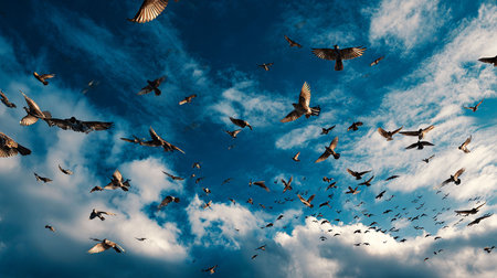 Dozens of sparrows soar through the air on a sunny day, showing their graceful flight patterns.