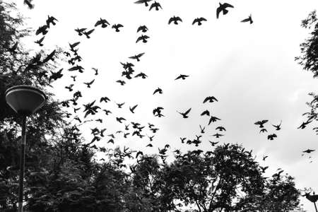 Silhouettes of pigeons. Many birds flying in the sky