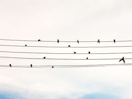 a few small birds a rest, sitting on the lines of high-voltage electric poles against the sky. Photographed close-up bottom.