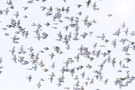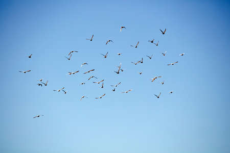 Birds flying in flocks freely in the blue sky in group in early morning.
