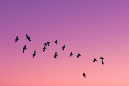 Bird flock silhouette in sunset sky, birds flying to sun. Beautiful sunset sky with flying birds, natural background. Regular seasonal bird migration to South and North along flyway