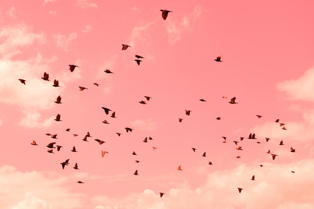 Pigeons were flying in the pink sky