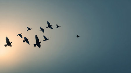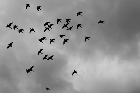 A flock of birds silhouetted against a moody sky, creating a dynamic and serene atmosphere of nature in flight.