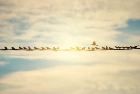 sunset on evening light pastel cloud on the sky and birds hang onthe power electric line
