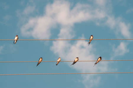 Barn swallow resting and playing on a cable. A fairly large, colorful swallow. Usually easy to identify with its long, forked tail and dark rump. row Moldova