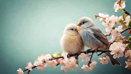 Two small birds are perched on a branch, surrounded by delicate pink blossoms. The birds are facing each other, creating a feeling of love and tenderness.