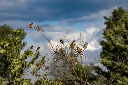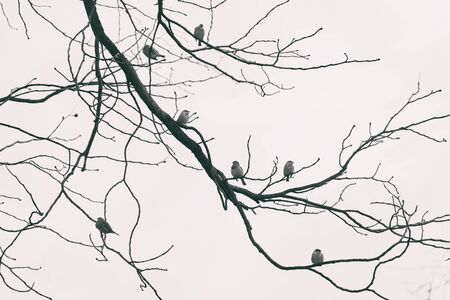 Flock of small bird sparrow sitting on tree branch on winter nature background.