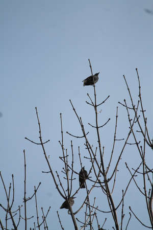 A winter cityscape. A colony of house sparrows on a bush against a bright blue sky in anticipation of spring with ringing chirps. copyspace.