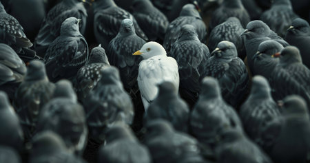 Standing out from the crowd , white bird standing between many gray birds - ai