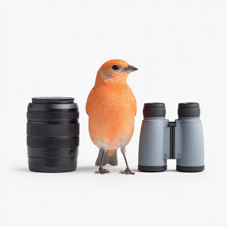 A striking orange bird stands confidently beside a camera lens and binoculars, inviting enthusiasts to explore the beauty of wildlife and nature photography with quality gear.