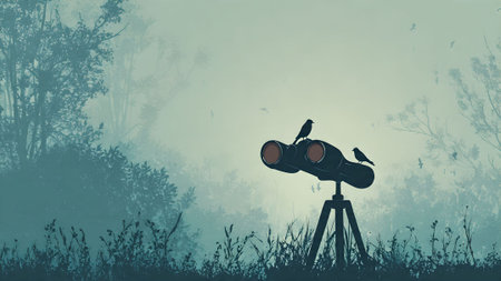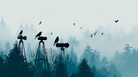 Silhouette of binoculars on a tripod with birds in a misty forest. Birdwatching and nature observation concept.
