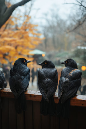 In a tranquil park setting, three black birds sit closely together on a wooden railing. Soft autumn leaves in shades of yellow and orange provide a warm backdrop as rain lightly falls, creating a serene atmosphere.