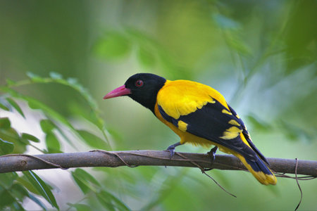 Golden oriole with striking black wings and tail, perched gracefully on a branch, surrounded by its vibrant natural environment