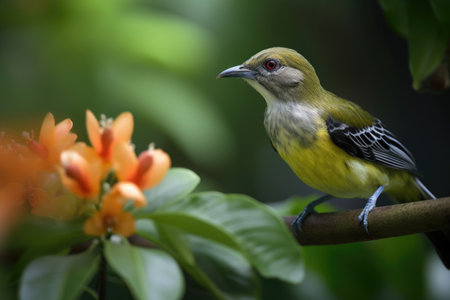 a bird perched on a flower, surrounded by lush greenery, created with generative ai