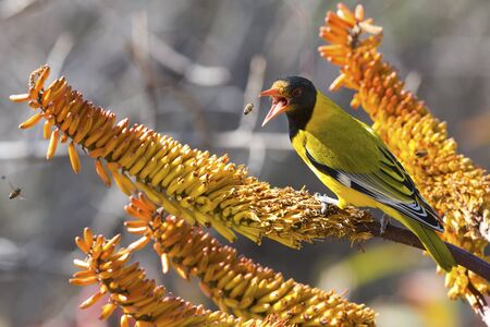 Black-headed oriole sitting on yellow aloe to catch wild bees