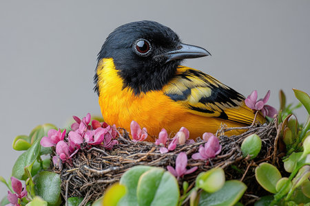 A striking yellow bird with a black head rests on a branch adorned with bright orange flowers. The photograph displays a shallow depth of field, with a soft green background. The lighting suggests a natural outdoor setting, offering potential uses for nature-themed projects, editorial content, and decorative purposes.