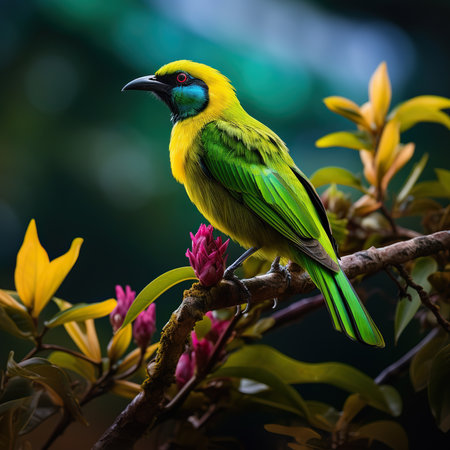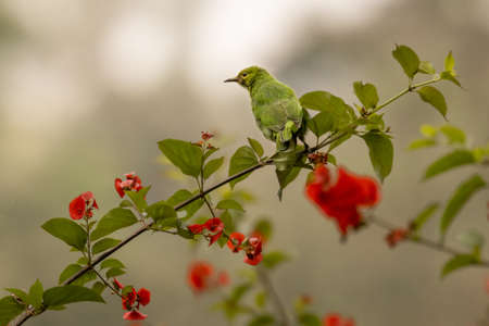Golden fronted leaf bird perched on branch with red flowers. Kerala India