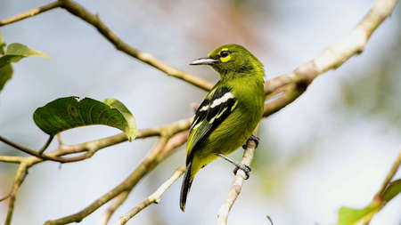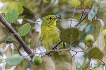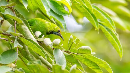 Aegithina viridissima bird enjoy eating fruit of banyan tree (food of birds and various animals in tropical rainforest) in nature in Thailand
