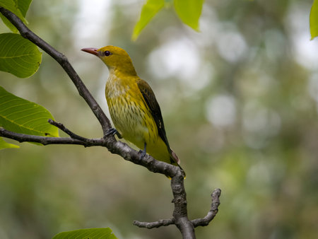 Young Eurasian Golden Oriole or Oriolus oriolus on tree branch