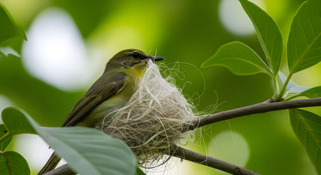 A small olive-yellow bird perched on a branch, tending to its intricate nest made of fine fibers. The image is framed by green leaves, capturing a moment of avian construction in nature.