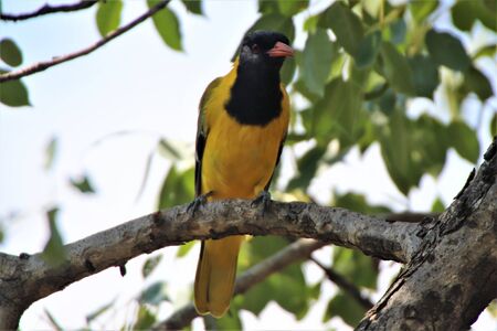 Black-hooded Oriole (Oriolus Xanthornus) perch on a banyan tree branch in Sri Lanka.